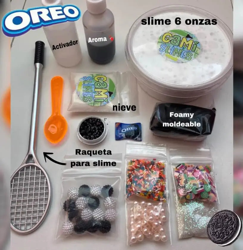 Kit de slime de galleta oreo: Incluye: slime 6 onzas blanco, aroma a chocolate, activador, cucharita, raqueta que también es lapicero, foamy negro, charm, brillos, perlas y cuatro bolsitas de fimos.